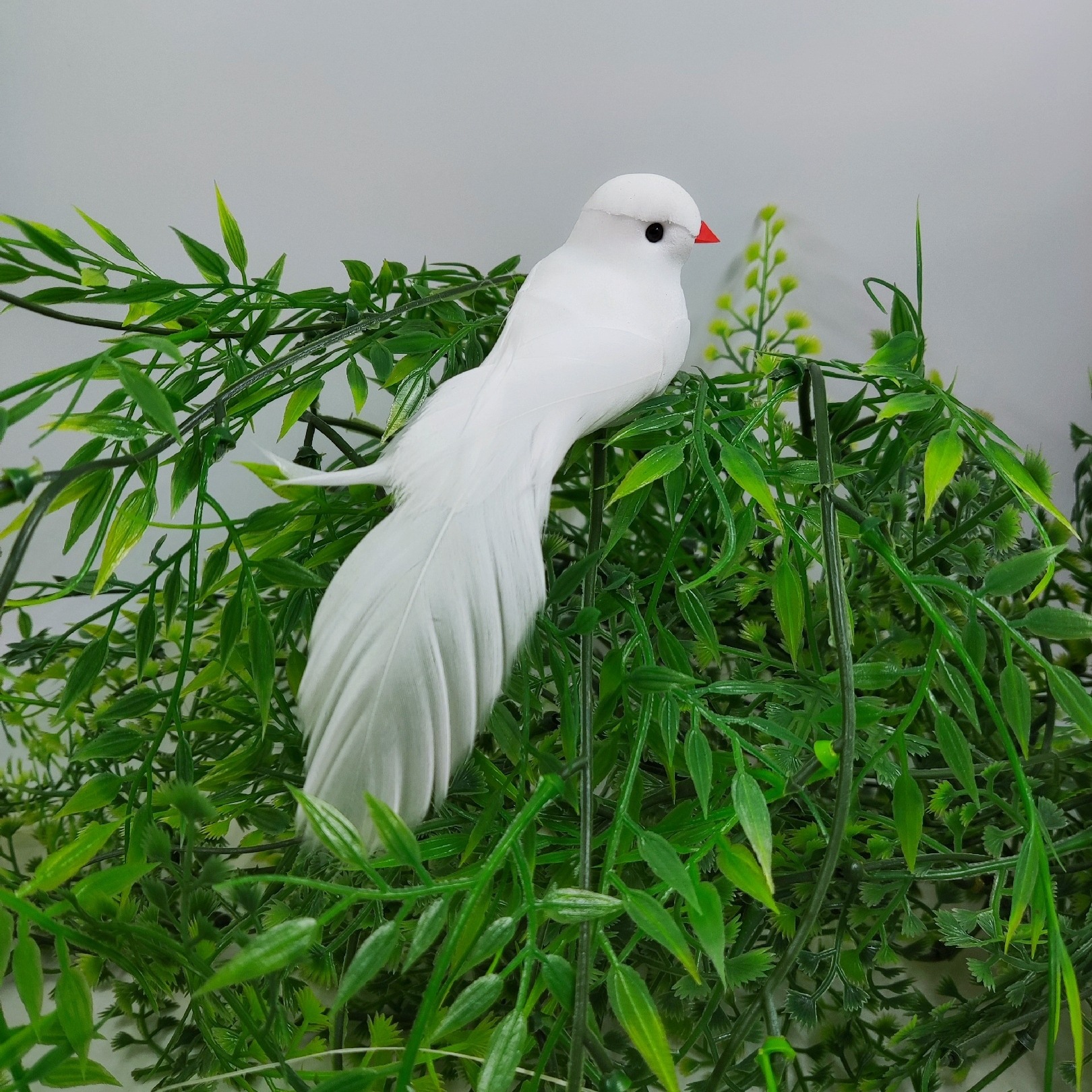 平和の鳩、模造白鳩、結婚式場、ショッピングモール装飾、羽根飾り鳩、緑の植物、小鳥、展開翼の鳩の形