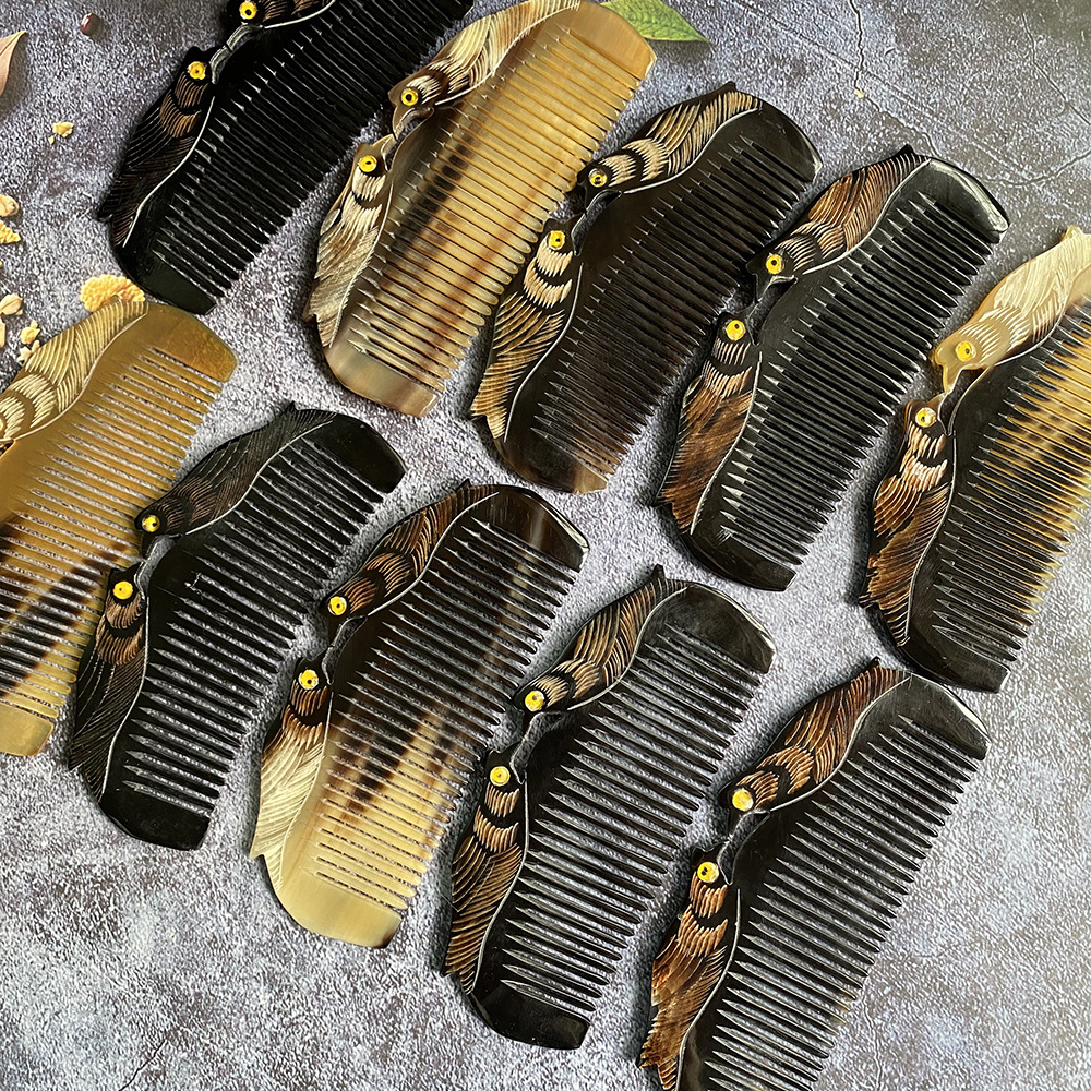 牛角櫛、黒鳳凰櫛、黒水牛角鳳凰櫛、工芸櫛、牛角櫛、龍と鳳凰の彫刻櫛、工場バッチ