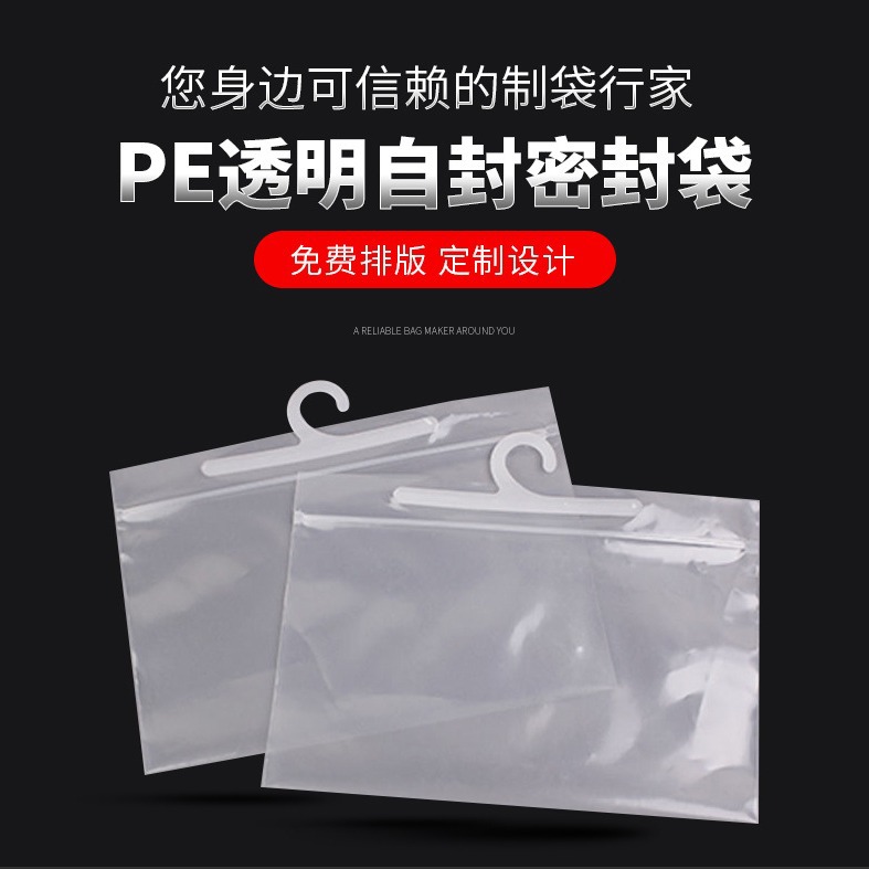 メーカーは耳付きの自封袋服装pe透明包装袋フック付きプラスチックビニール袋をカスタマイズした