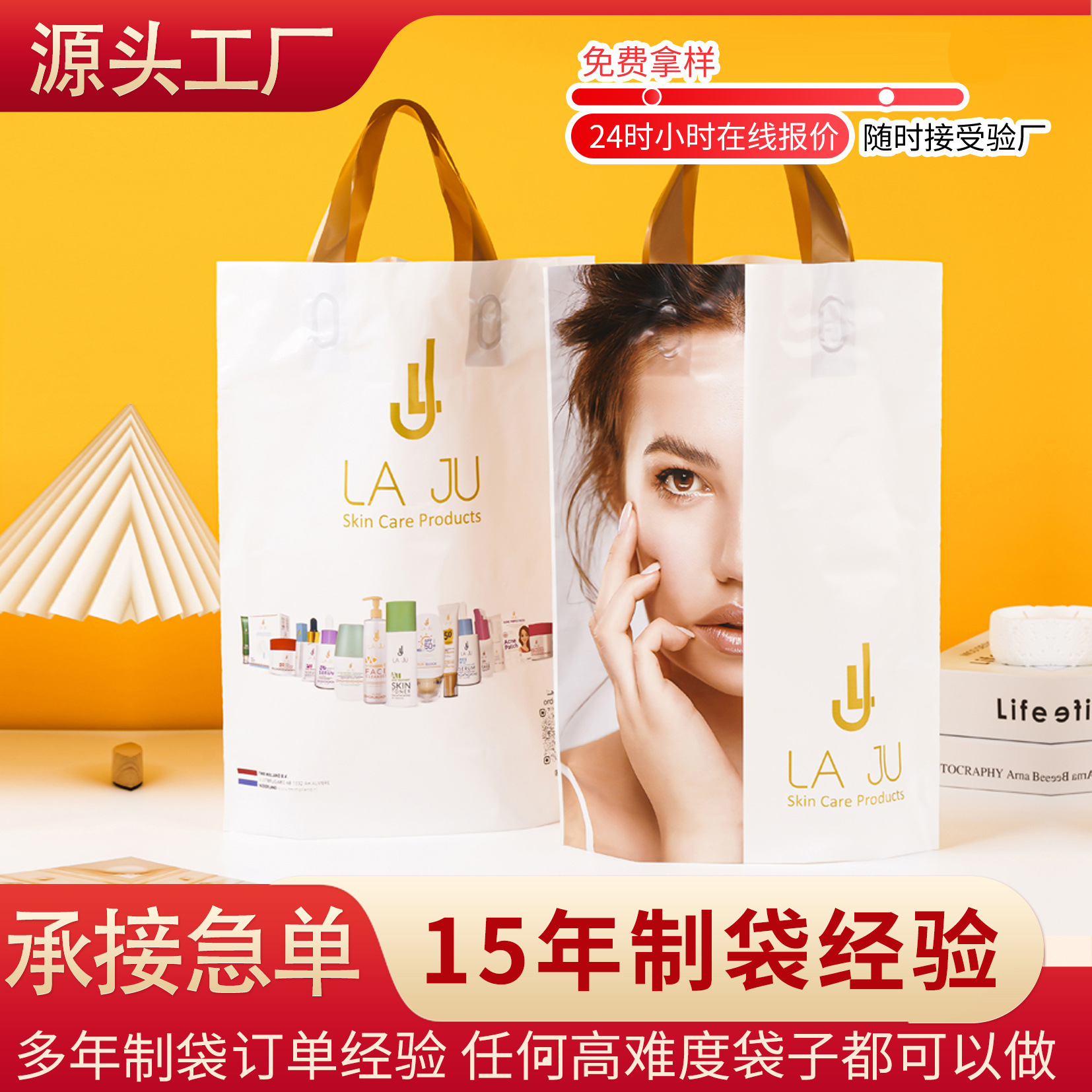プラスチック包装ハンドバッグ、カスタムショッピングバッグ、スーパーマーケットギフト、広告写真入り、穴あき、高圧、平口、便利な包装袋