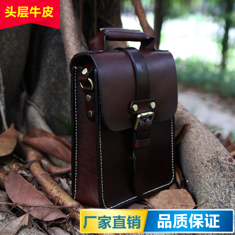 植物なめし層牛革男性ハンドバッグ手作り縫合片肩男性バッグ