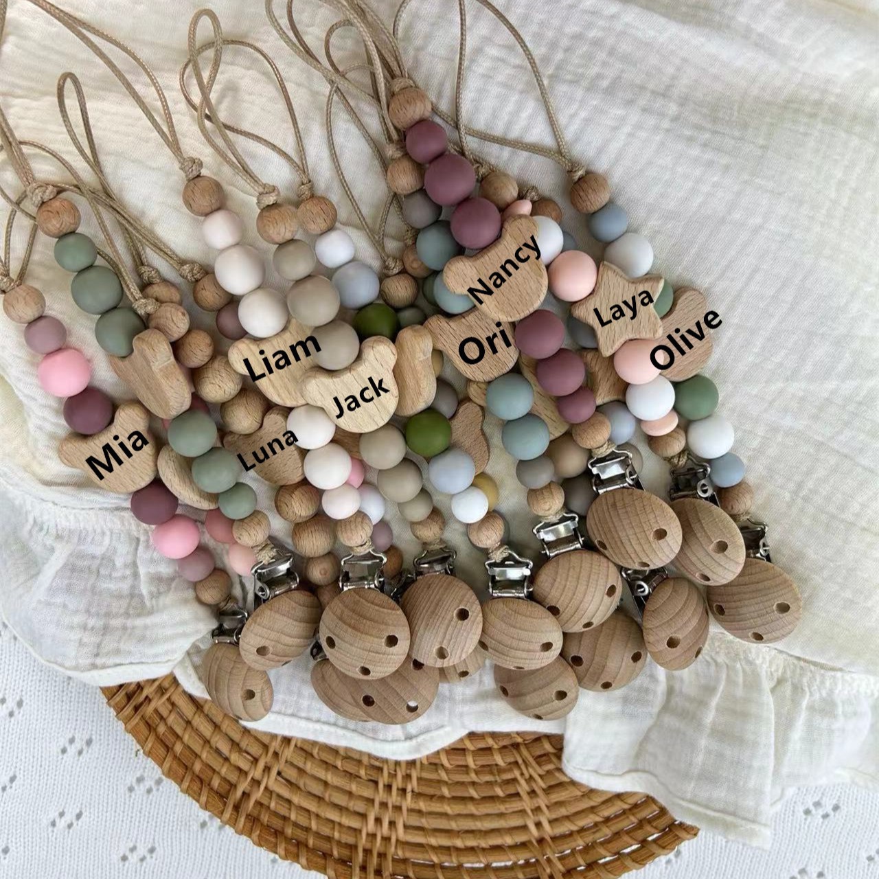 新しい乳幼児の漫画の愛のケヤキの歯のゴムの純粋な手作りの蝶結びのおしゃぶりのチェーンは赤ちゃんの5つのセットをなだめます。