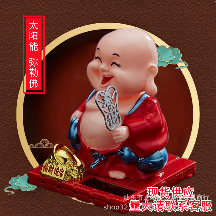 太陽エネルギーの弥勒仏の置物は頭を振ります。