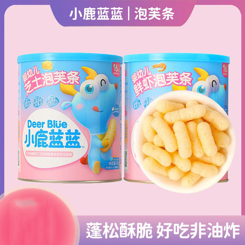 小鹿藍青乳幼児の指シュークリームは6ヶ月の赤ちゃんのカジュアルなお菓子の新鮮なエビのチーズの味のシュークリームを食べます。
