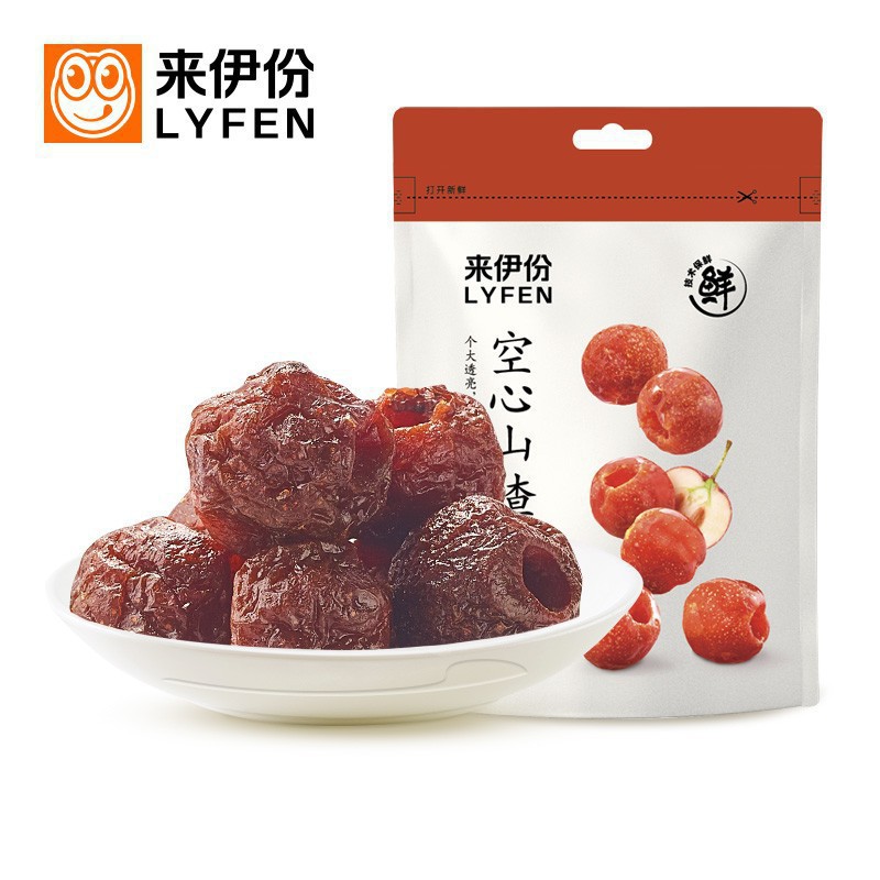 中空の大きなサンザシを種抜きにして個別包装した熟したサンザシ、酸味と甘味が調和した柔らかくもちもちしたサンザシの保存食、おやつ