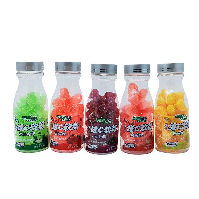 漫画ジュース缶入りソフトキャンディー、桃、イチゴ、青提風味のお土産、スナック、キャンディー、グミ、卸売