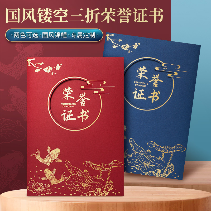 国風三つ折り栄誉証明書カスタム錦鯉ハスの花箔押し封止透かし受賞賞状カスタム証明書ケース