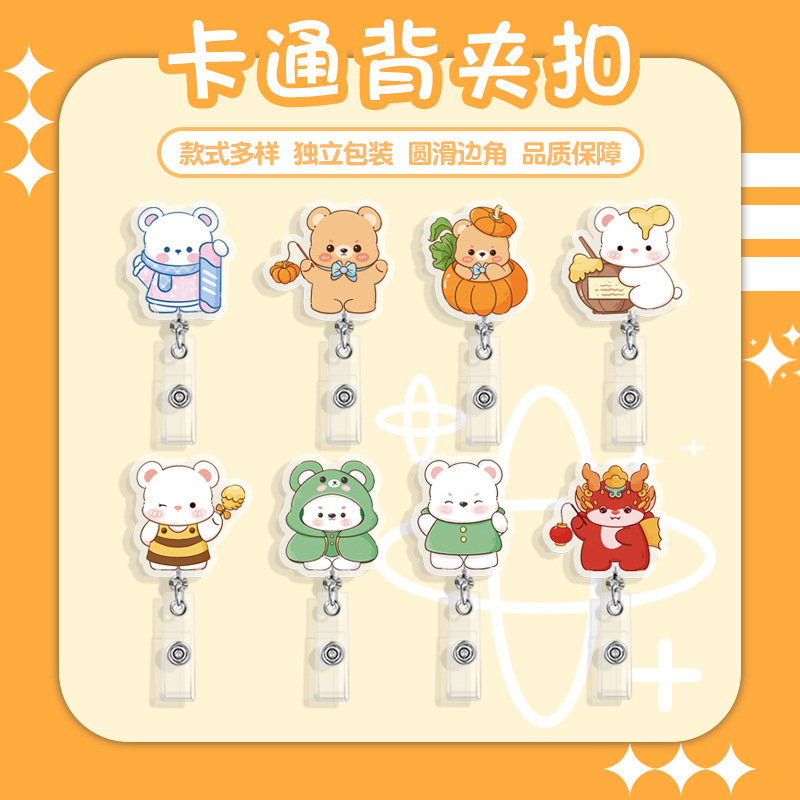 創意的な透明バッククリップが可愛いです。熊伸縮ボタンは学生の胸のブランドの学校の張力ボタンです。