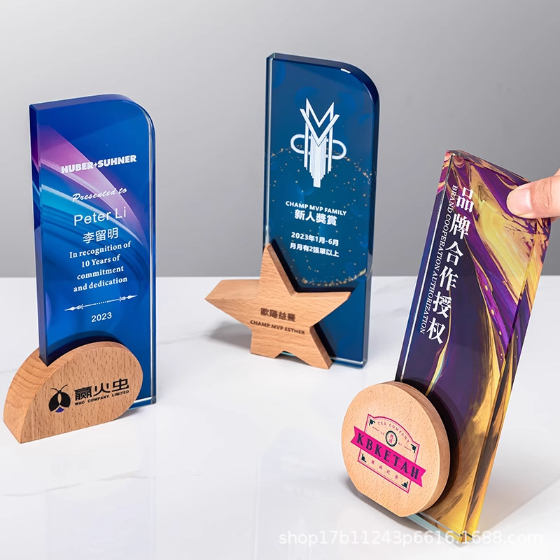 アクリル水晶トロフィーカスタム来図加工創意メダル会社周年木造賞座メーカー卸売り新