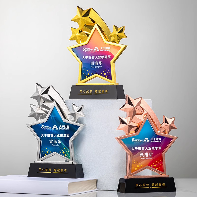 クリスタルメタルトロフィーカスタマイズされた金、銀、銅の五芒星トロフィー企業会社の年次優秀従業員賞