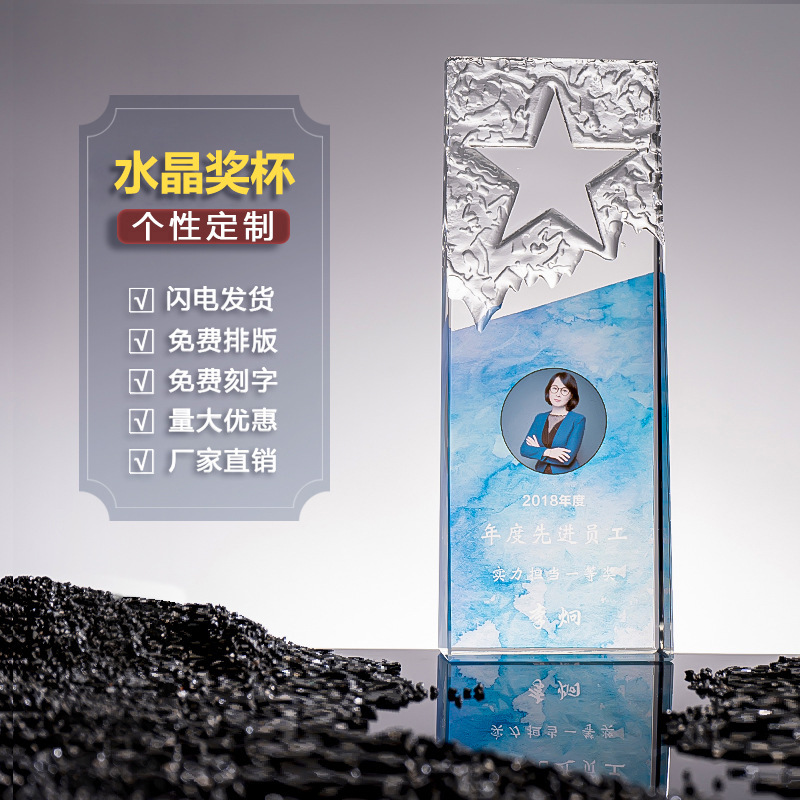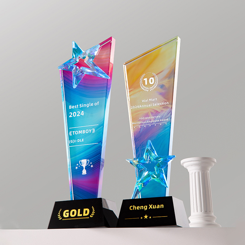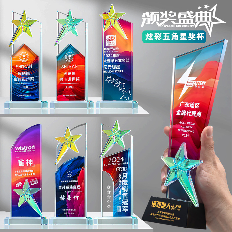 名誉クリスタルカラープリントトロフィーカスタマイズされたクリエイティブな五芒星無料彫刻年次総会優秀従業員賞カスタマイズ