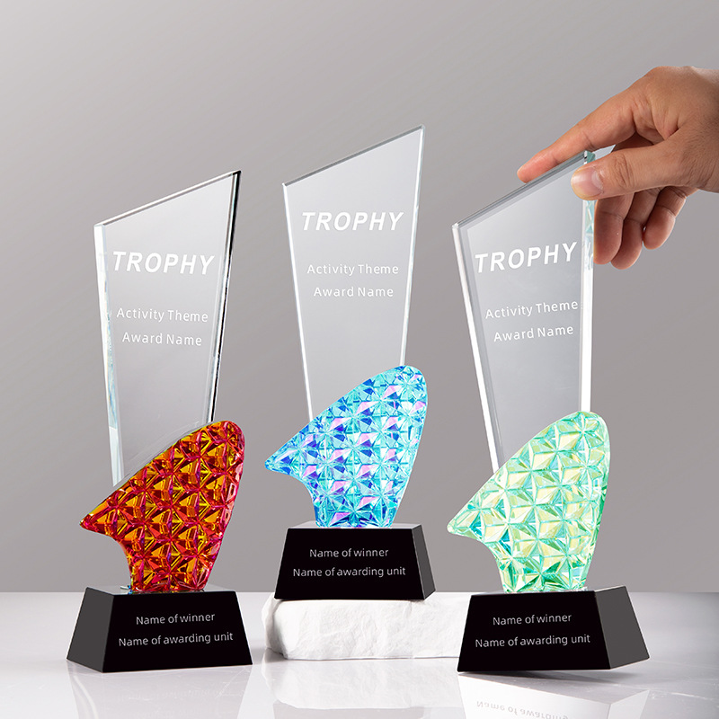 卒業シーズンクリスタルトロフィーカラフルな新しい波状クリスタルトロフィー金属要素賞色印刷クリスタルメダル