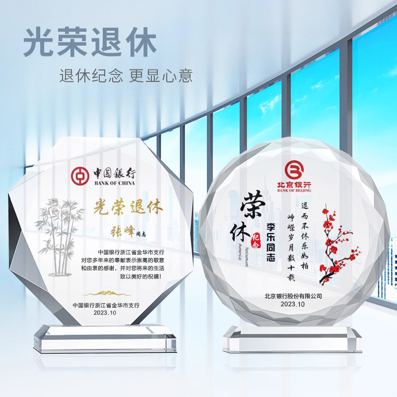 栄休記念品高級大気水晶トロフィー優秀社員光栄退職感謝メダル