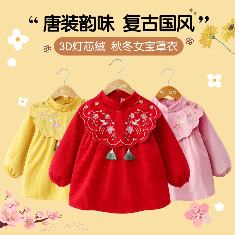 秋冬の唐服の女性の赤ちゃんの服の食事の国の潮の中国風のエプロンの子供は服の3dのコーデュロイの防水を着て汚れを防ぎます。