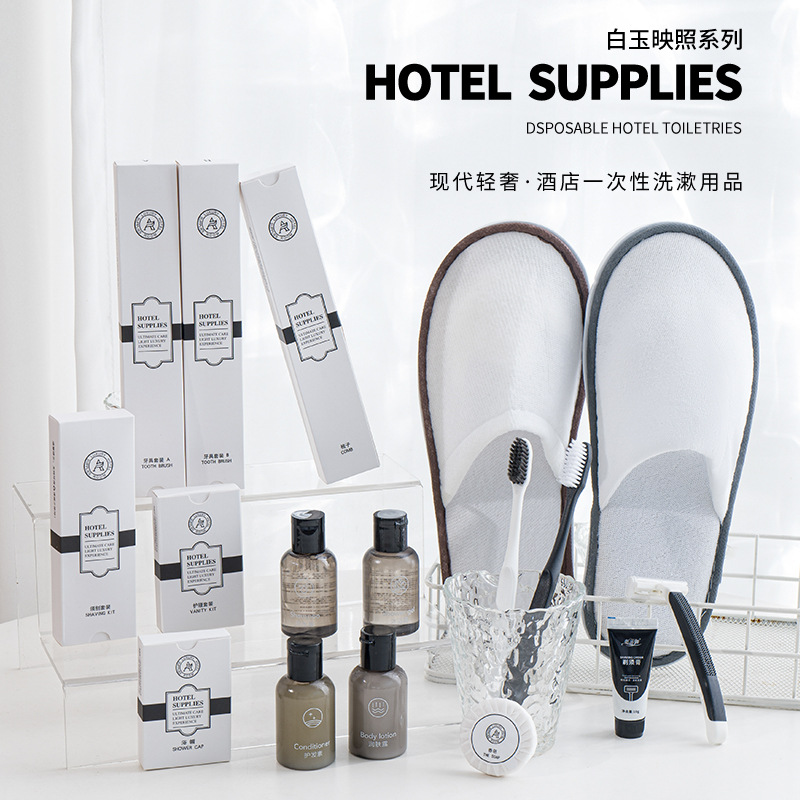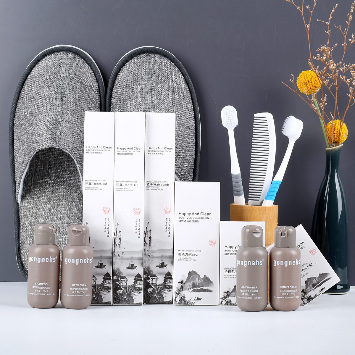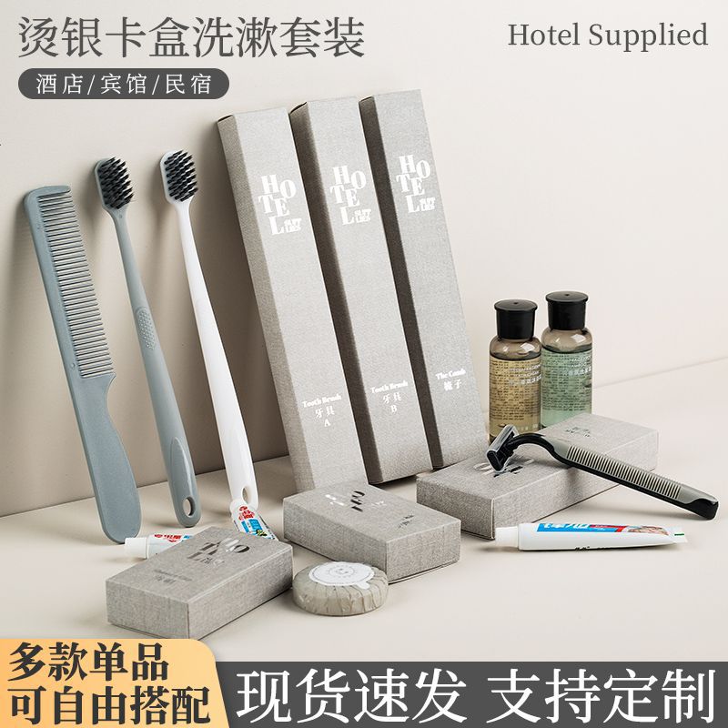 使い捨て歯ブラシとアメニティセット、インクカードボックス、使い捨てスリッパ、ホテル歯ブラシとカミソリ
