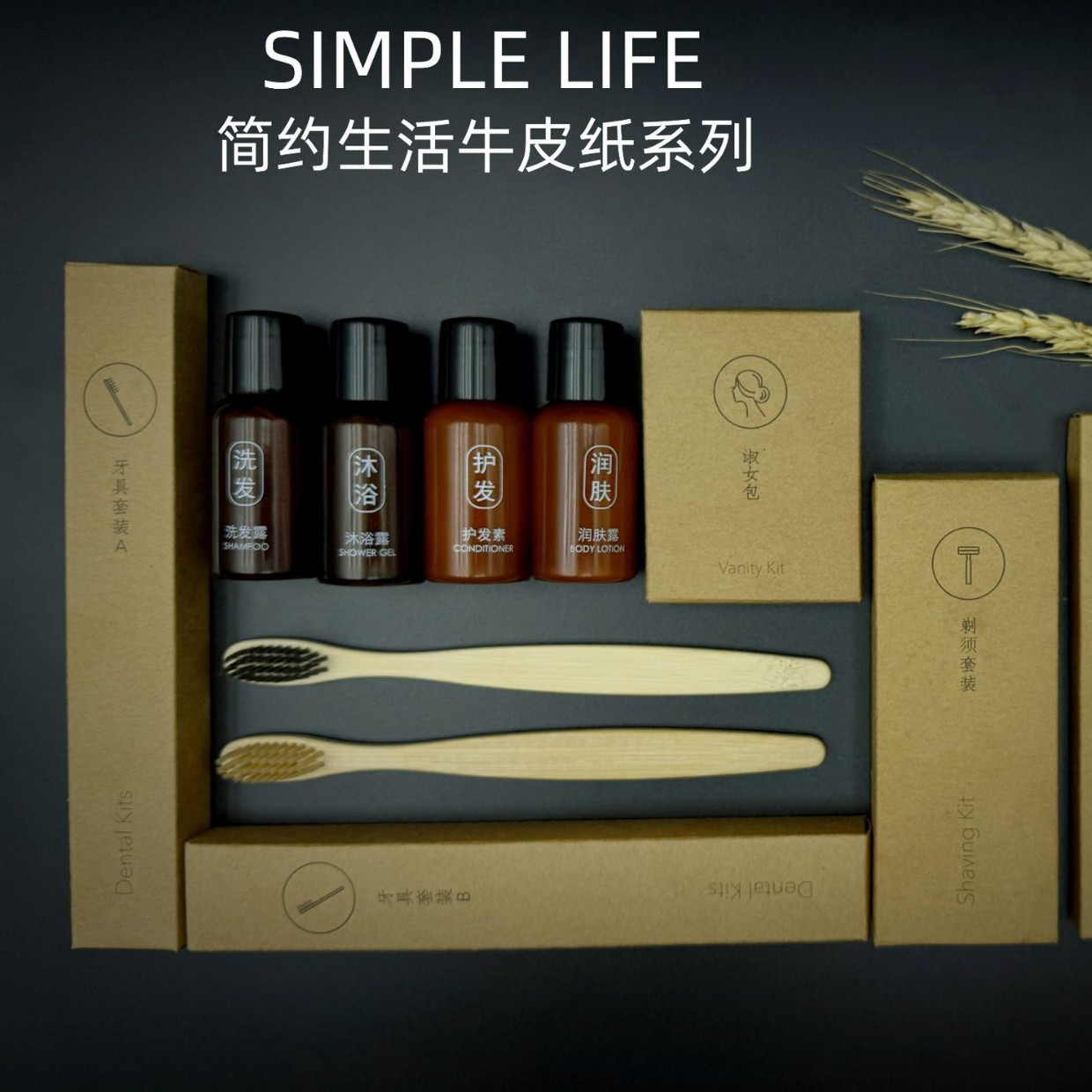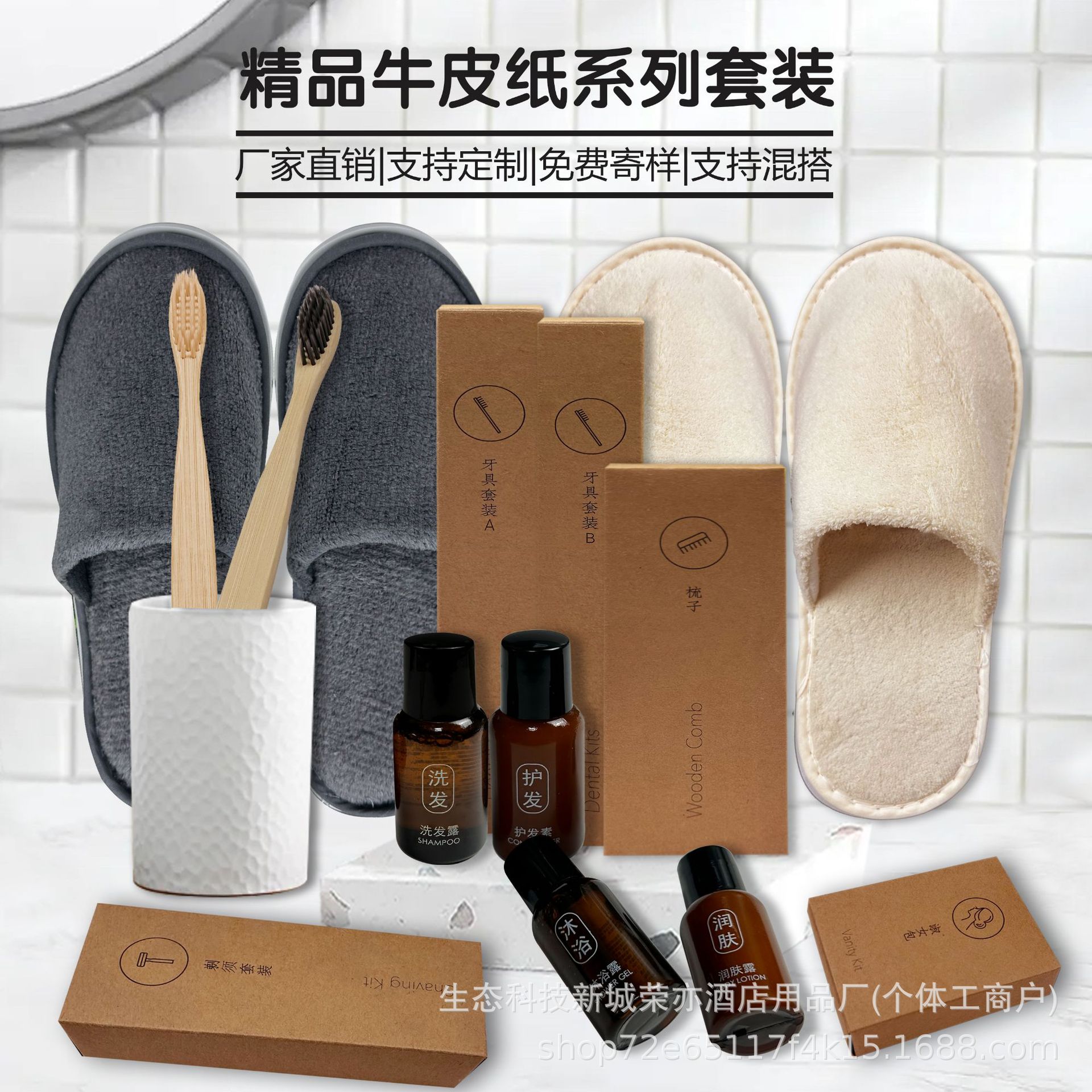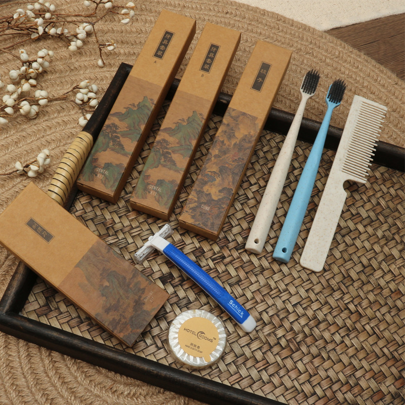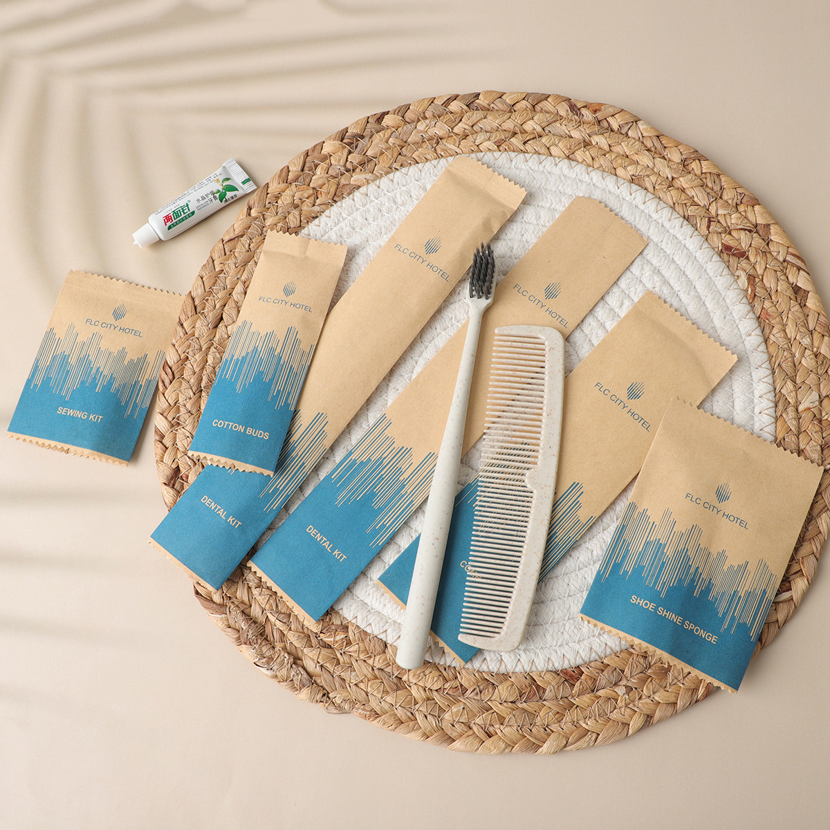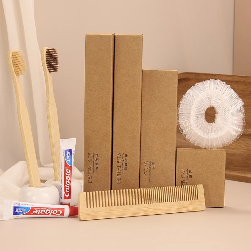 ホテルの使い捨て用品セットは、クラフト紙箱、竹歯ブラシ、木製櫛、環境に優しく分解性に設計できます。