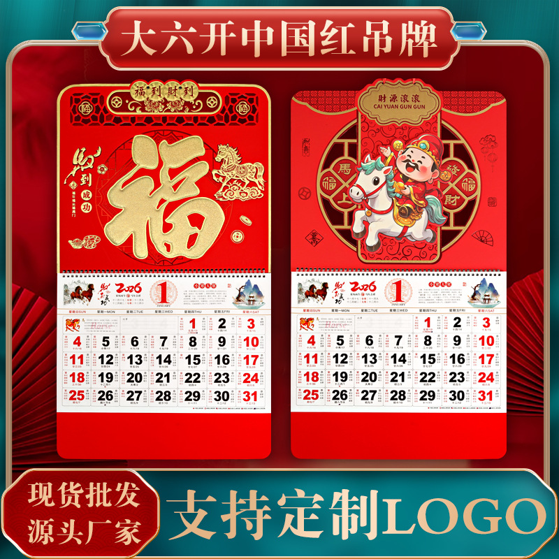 2026年馬年壁掛けカレンダー正六開き金箔祝福タグ壁掛けカレンダー特別版広告ホットスタンピングロゴカレンダー油圧