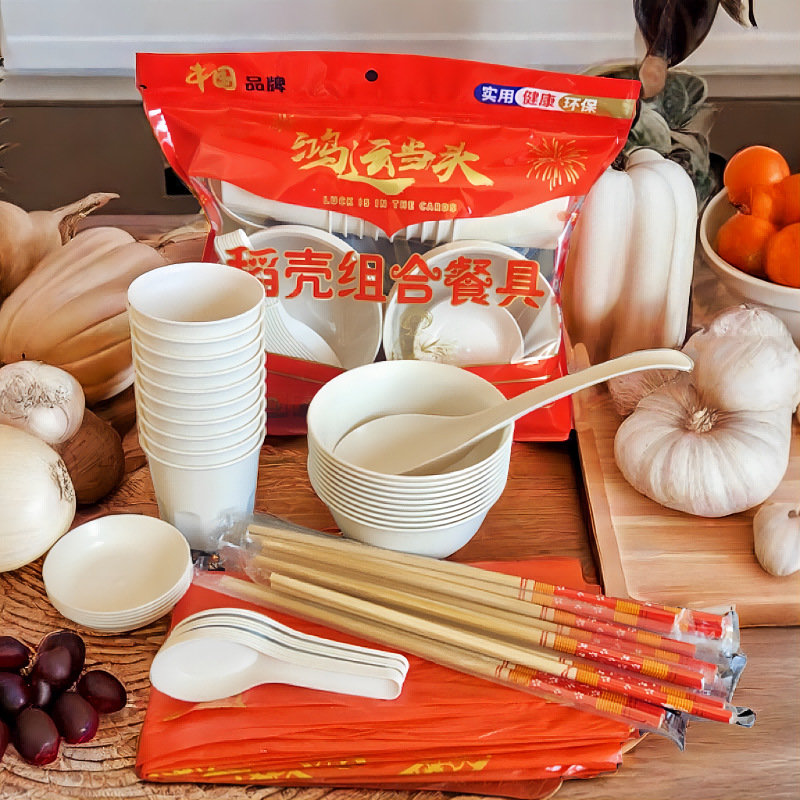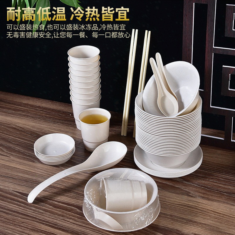 生分解性の便利な食器セット、稲殻使い捨て食器、家族の食事、家庭用ピクニック、カップ、スプーン、環境に優しい素材