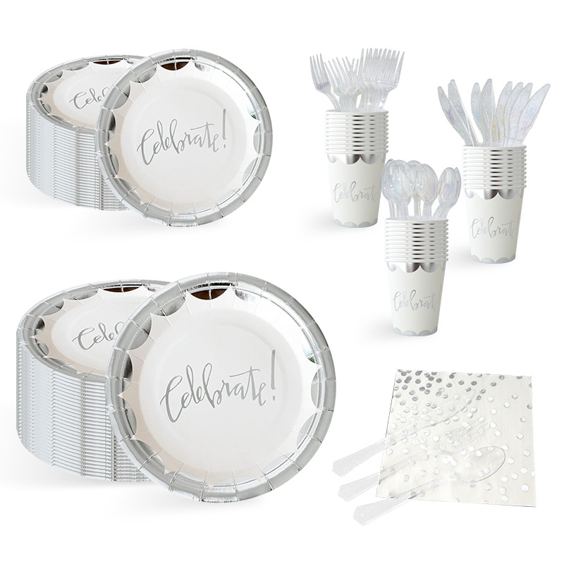パーティー祝銀色食器セット誕生日パーティー皿紙コップケーキ皿ティッシュ紙皿装飾現物