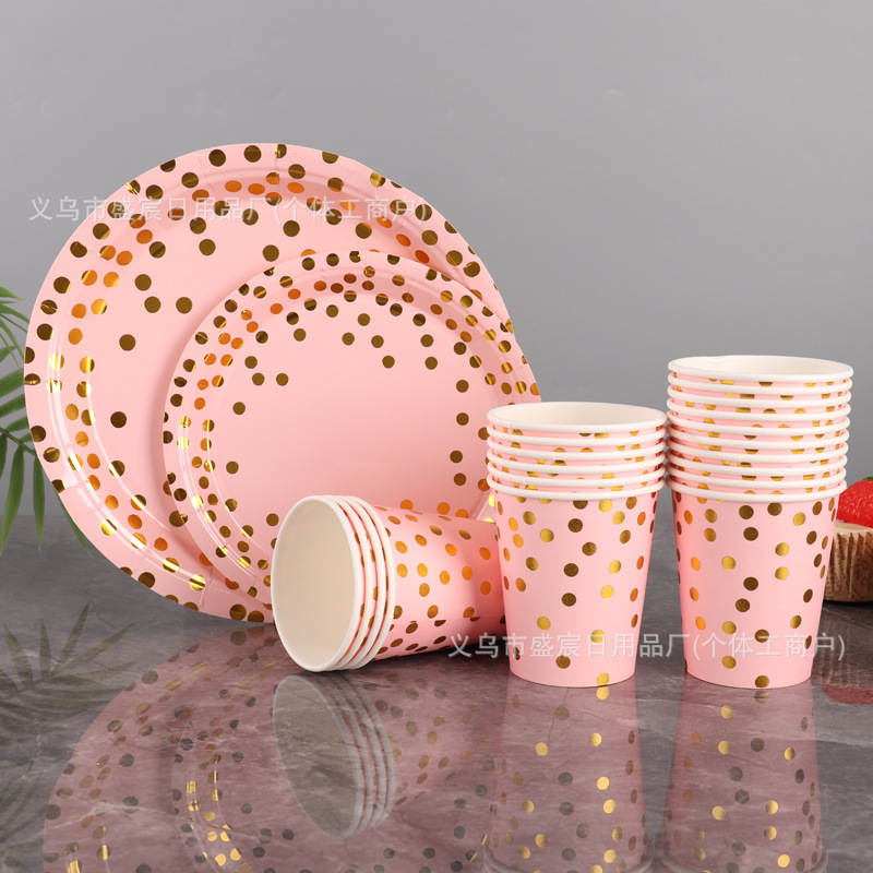 使い捨てピンクの点箔押し紙盤紙カップセットパーティーテーブルクロス紙ナイフフォークスプーン現物卸売り