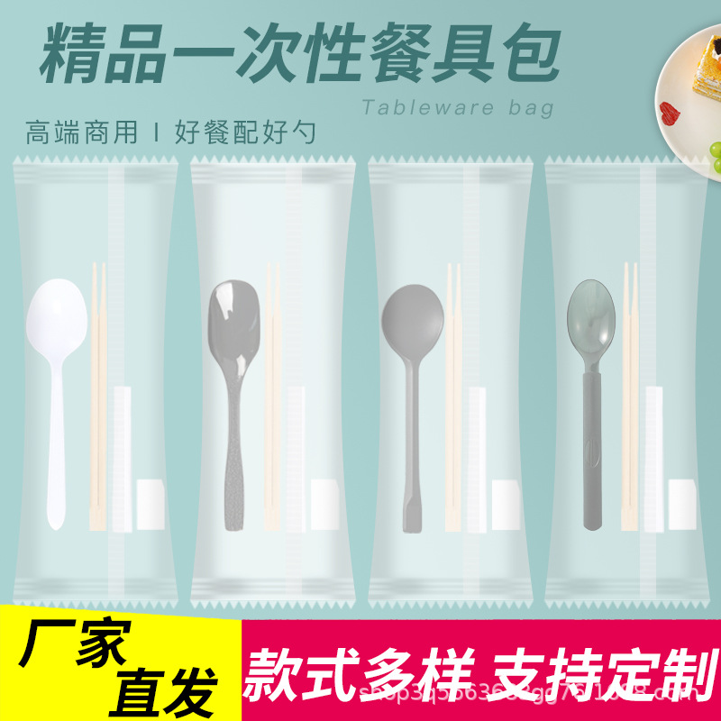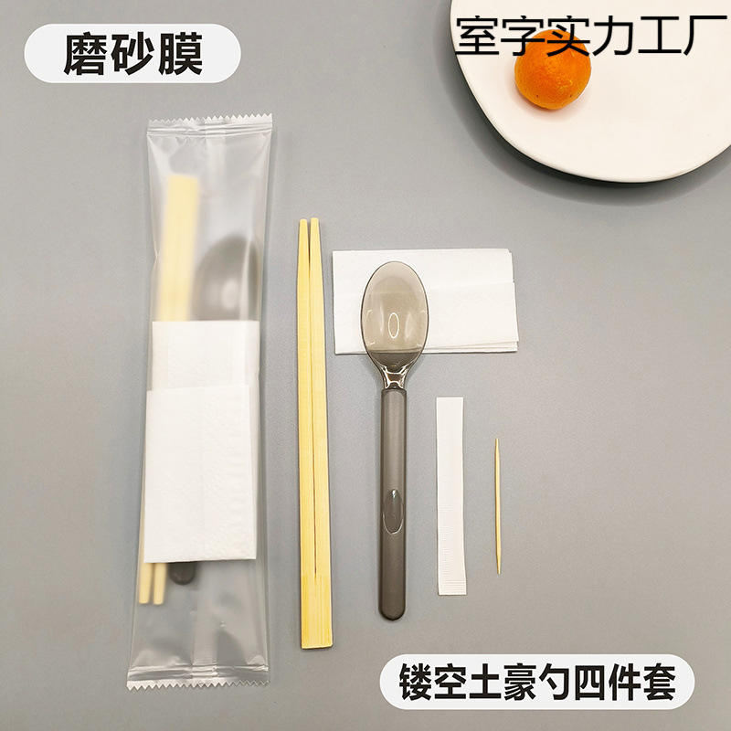 使い捨てテイクアウト4点カトラリーパッケージ、つや消しフィルム、アメリカンスプーン、太めビビンバ、4in1工場直販