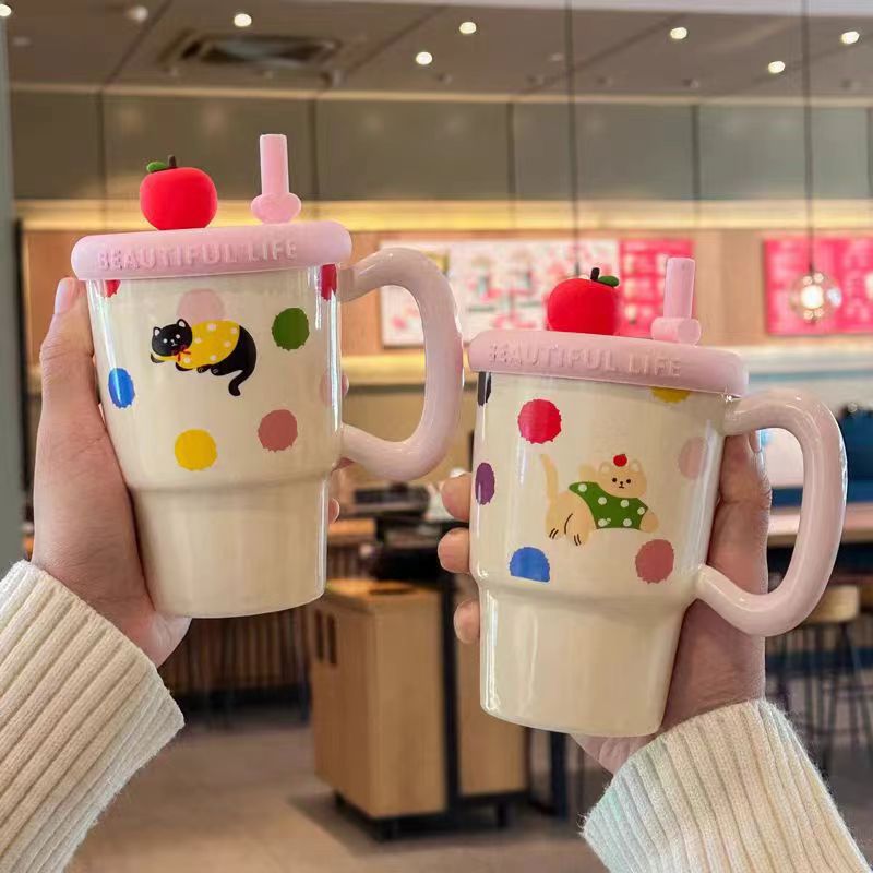 高颜値巨覇創意陶磁器マグカップコーヒーカップ萌え趣味可愛いストロー蓋付きカップ事務室カップ