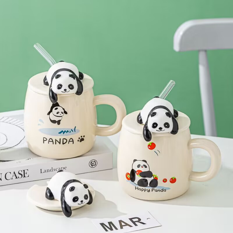 パンダセラミックカップ蓋付きスプーン付き高颜値マグカップカップルかわいいカップ女子コーヒーカップ男子