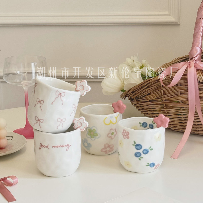 かわいい花のカップ、手描きのリボン、水彩の花、手で絞った不規則なセラミックコーヒーカップ、ラテアートウォーターカップ