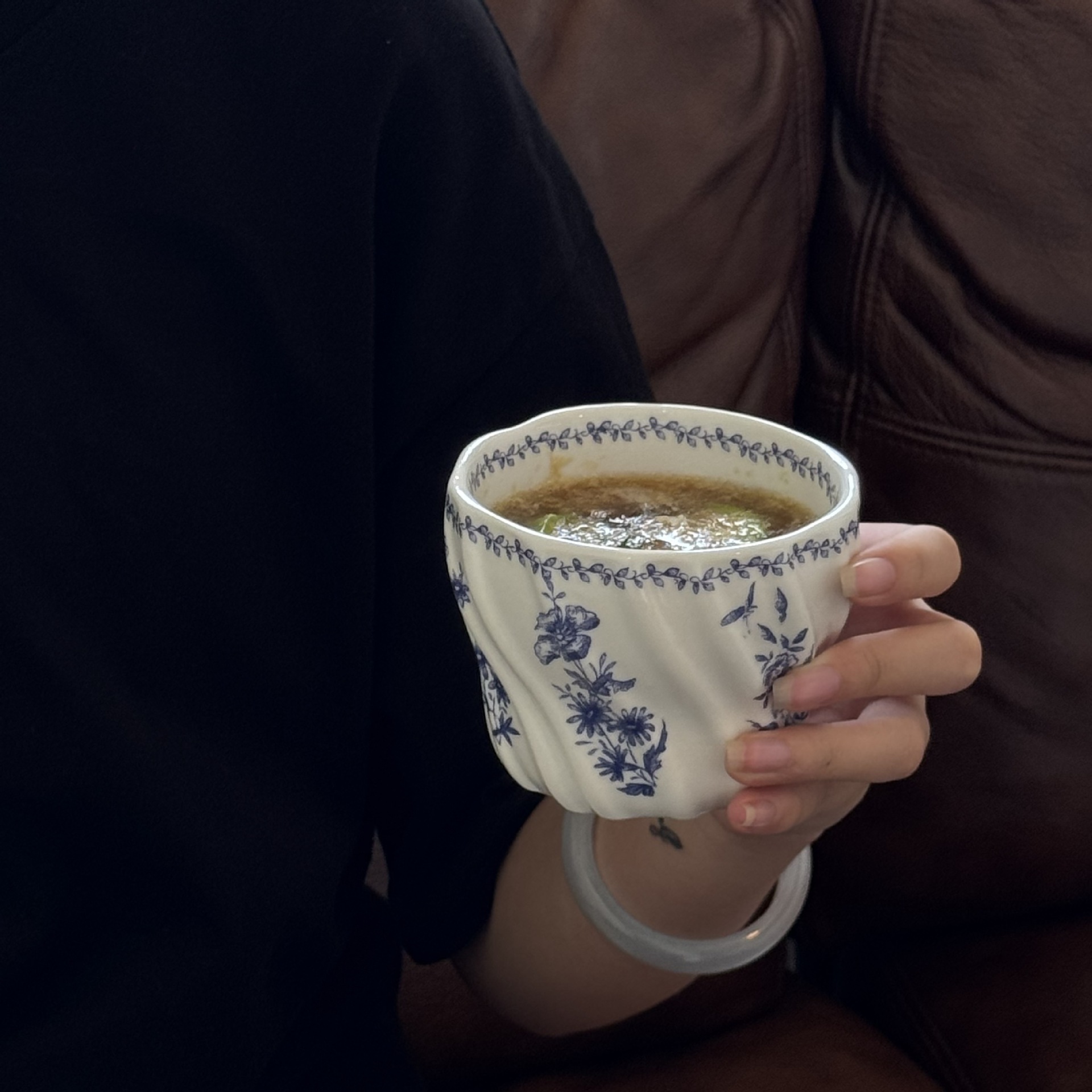 フランスのレトロな花の手は杯の陶磁器のコップのコーヒーの杯を握ります。