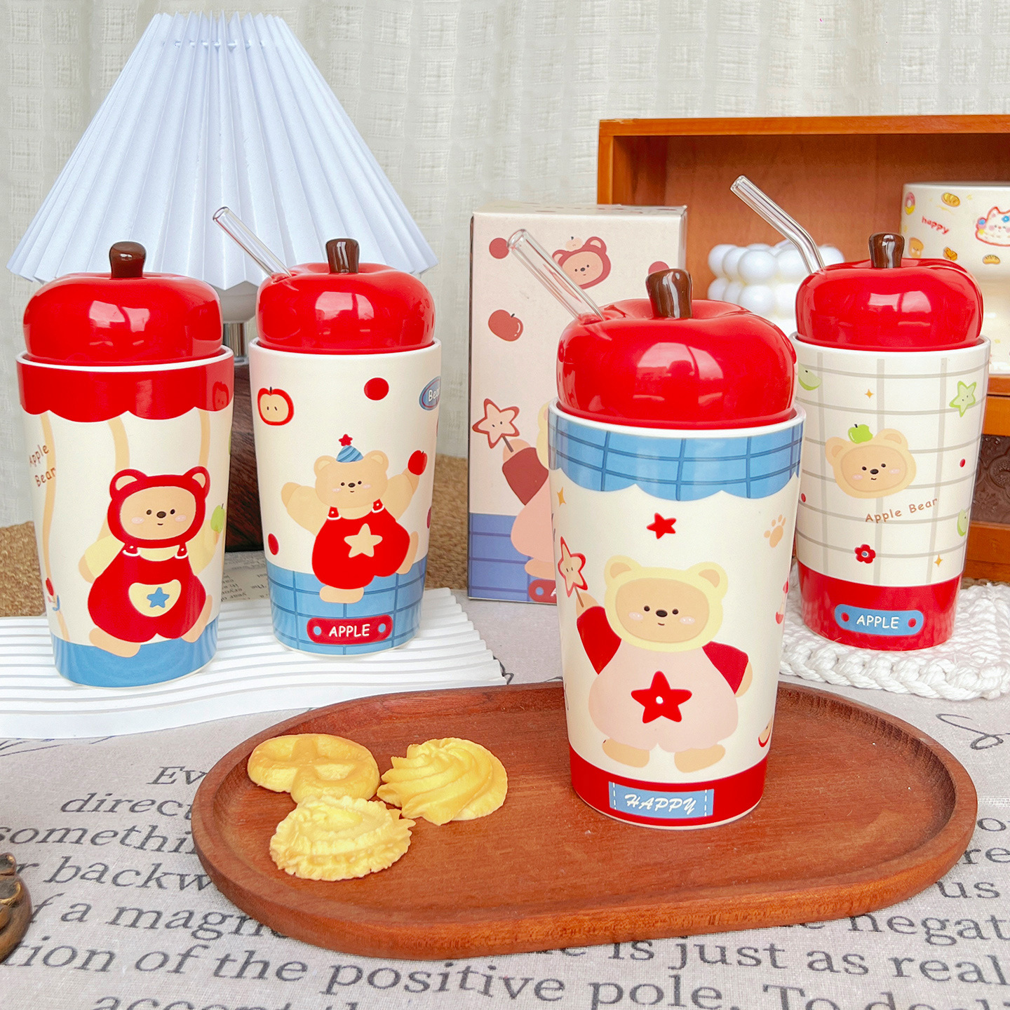红苹果小熊陶瓷杯子高颜值可爱大容量水杯女生节日礼物吸管杯子