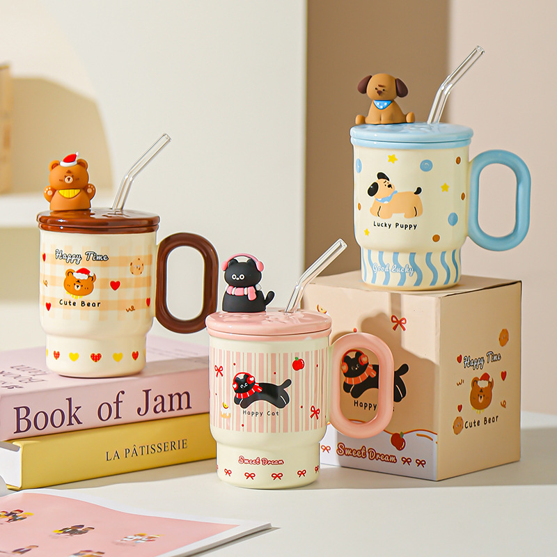 2025夏天新款吸管杯涂鸦动物陶瓷带盖水杯卡通马克杯可爱生日礼物