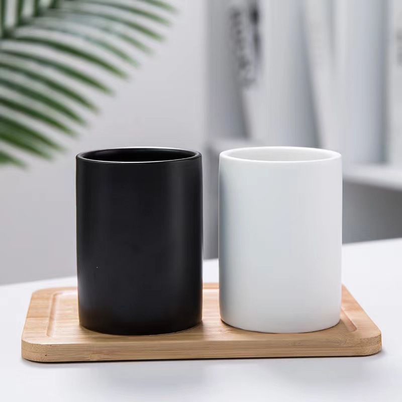 日本製セラミックマグホテルカップマウスウォッシュカップ竹プレート付き黒と白のトラベルマグ印刷可能