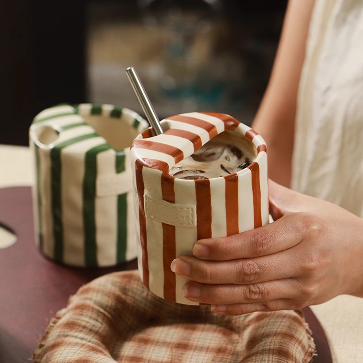釉下彩复古撞色条纹陶瓷咖啡杯ins简约手捏杯情侣闺蜜家用送礼