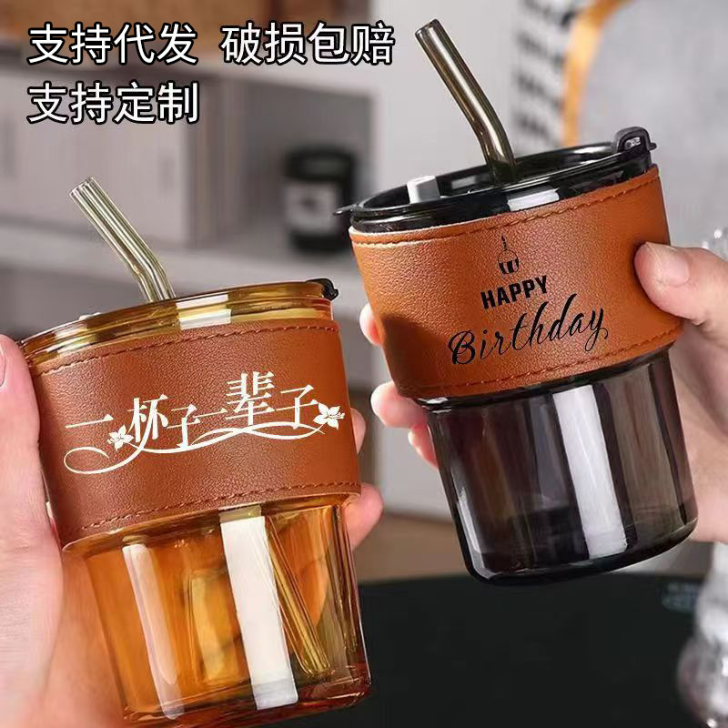 ネット赤高颜値竹節杯ins携帯蓋付きコーヒーカップストローカップ創意事務室ガラスストローカップ