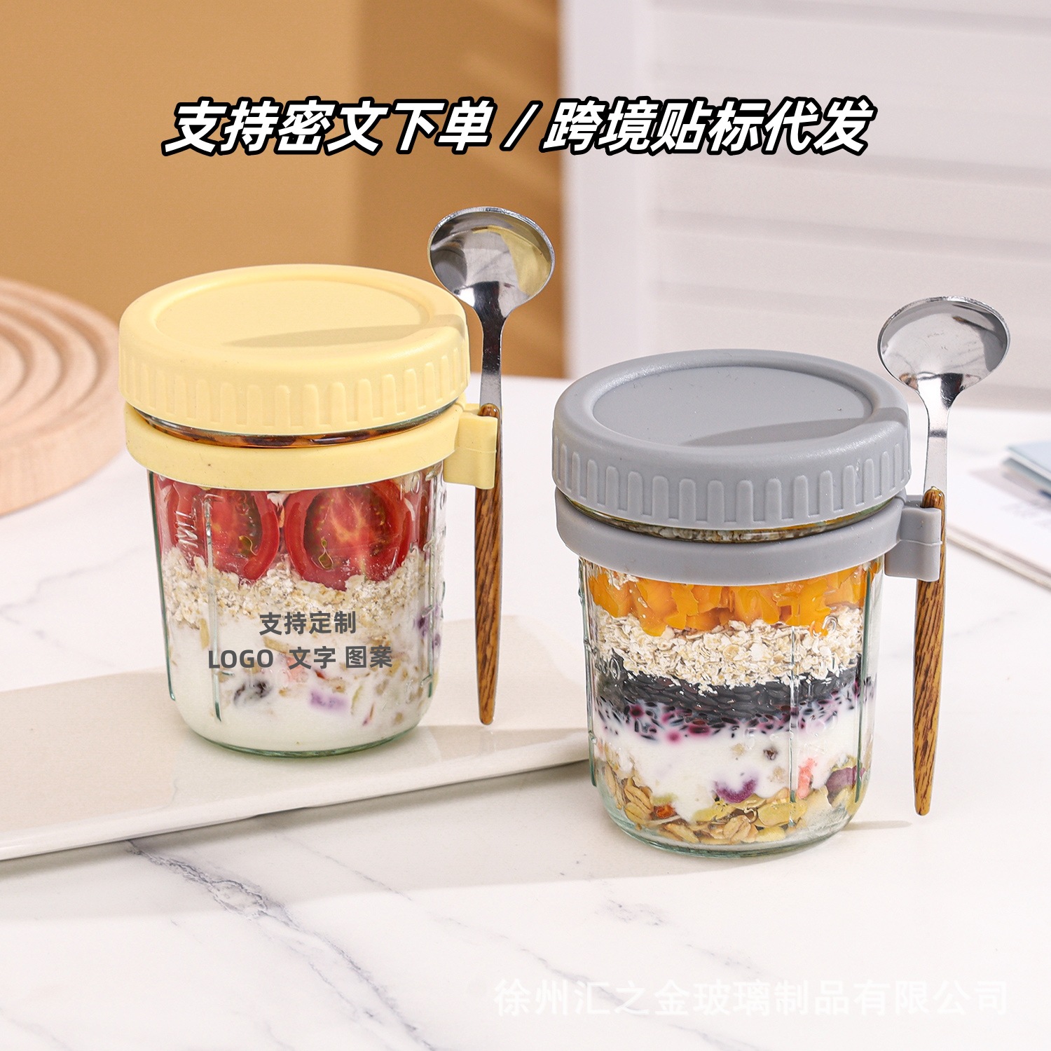 夜通しのオート麦の杯の携帯ヨーグルトの杯の朝食の杯はスプーンの高い顔の値のガラスの密封の缶のオート麦の牛乳のサラダの杯を掛けます