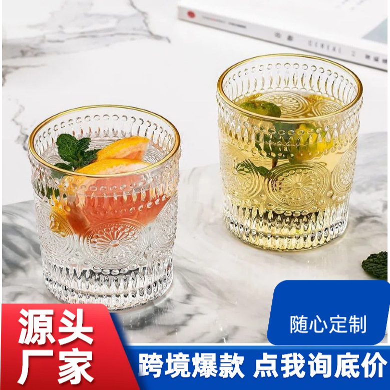 鉛フリーガラスコップの復古風彫刻透明カップ家庭用牛乳飲料カップセット