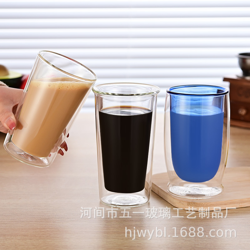 既製品卸売二重ガラスカップ カラフル透明コーヒーカップ 耐熱断熱厚手家庭用朝食カップ
