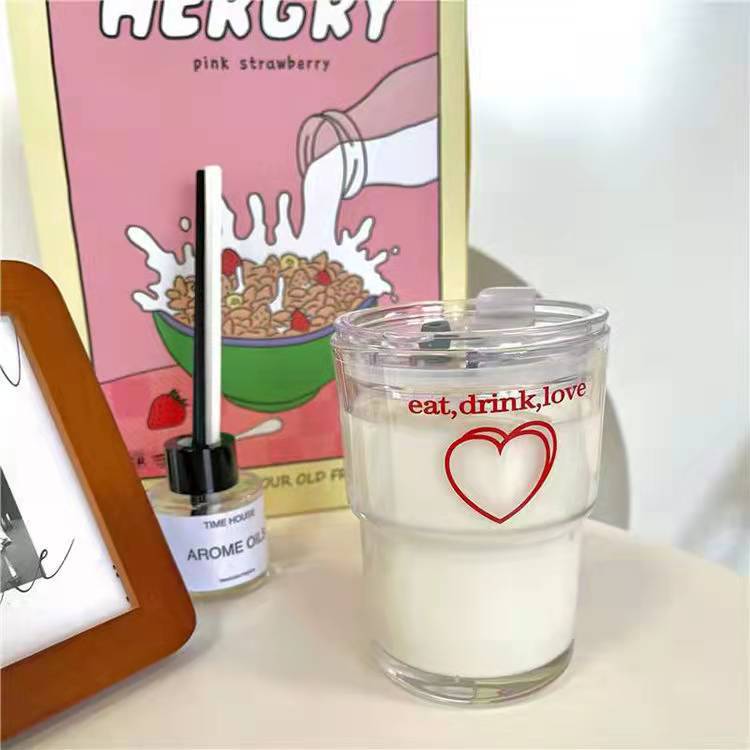 Ins風高颜値牛乳カップストローカップ蓋付きガラスカップ随行ストローカップネット赤ミルクカップ子供