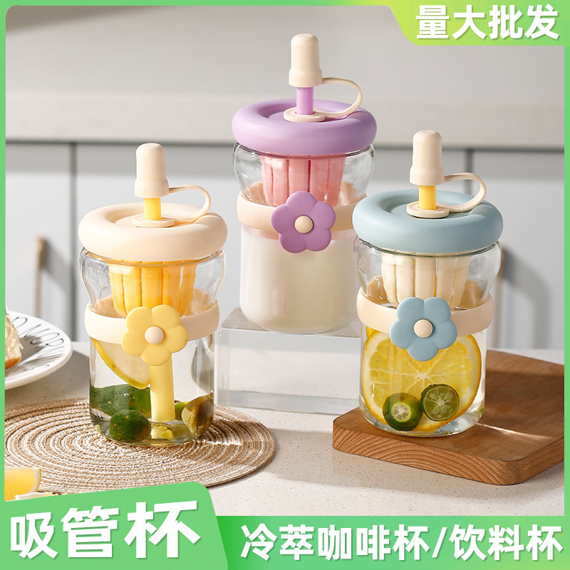 国境を越えた人気の大容量フラワーティーカップストローガラス高ホウケイ酸車載アイスカップ高価値男性と女性のウォーターカップ