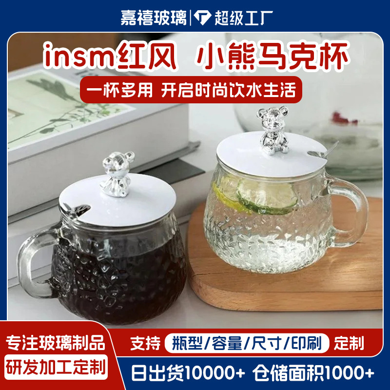 ハンマーパターン クマ ガラス マグ コーヒーカップ シンプル インススタイル ハンドルと蓋付き 朝食カップ 透明ティーカップ
