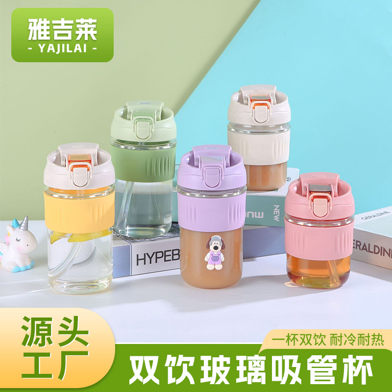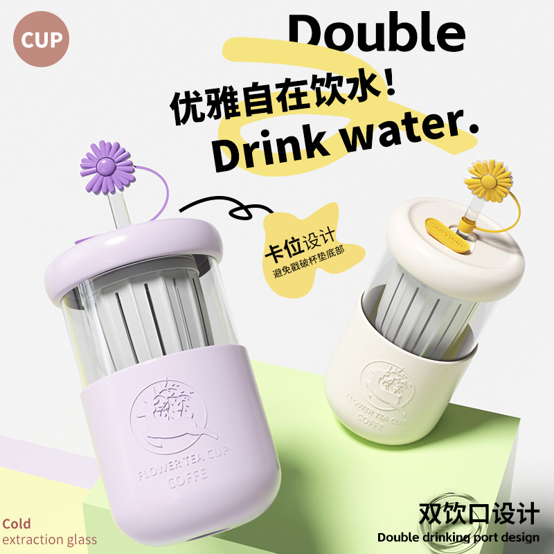 卸売りガラスストローカップ双飲蓋コーヒーカップ男女携帯高颜値カップ耐熱高ホウ素シリコングラス
