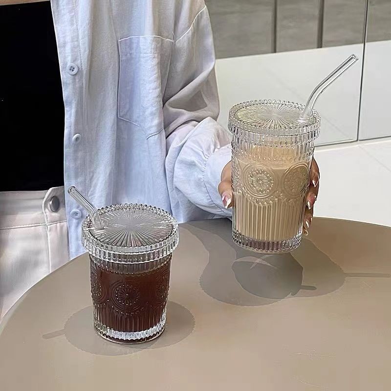 北欧ins風レトロ浮き彫り太陽花コップ蓋付きストローグラス冷飲カップジュースカップコーヒーカップ