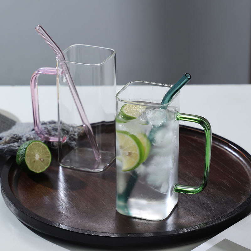 クリエイティブな四角いストロー付きガラスカップ、ハンドル付き、オフィス用男女兼用ガラス製ウォーターカップ、高ホウケイ酸ガラスカップ