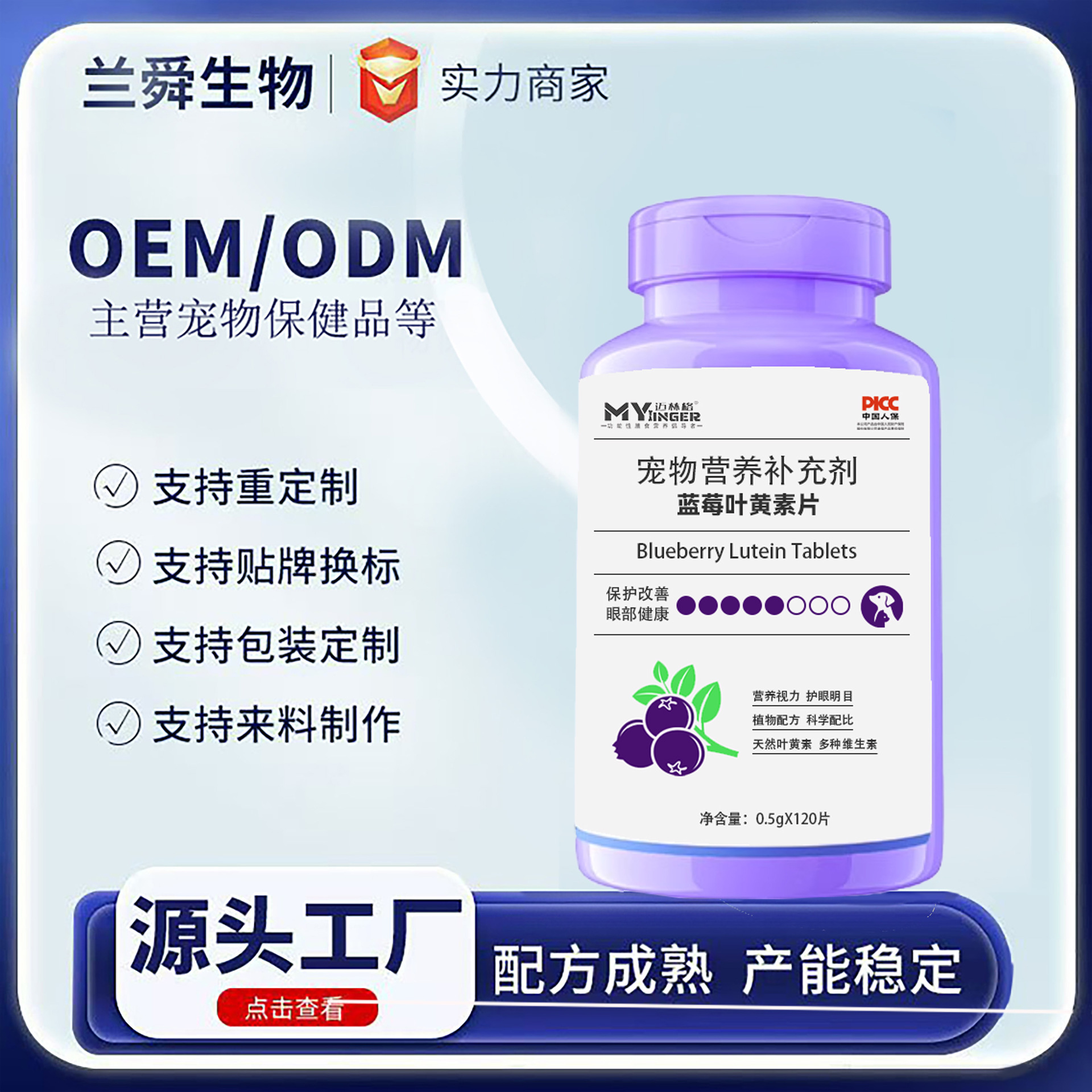 ペット用ブルーベリールテイン錠、犬猫専用、一般加工元工場、ペット用栄養・ヘルスケア製品