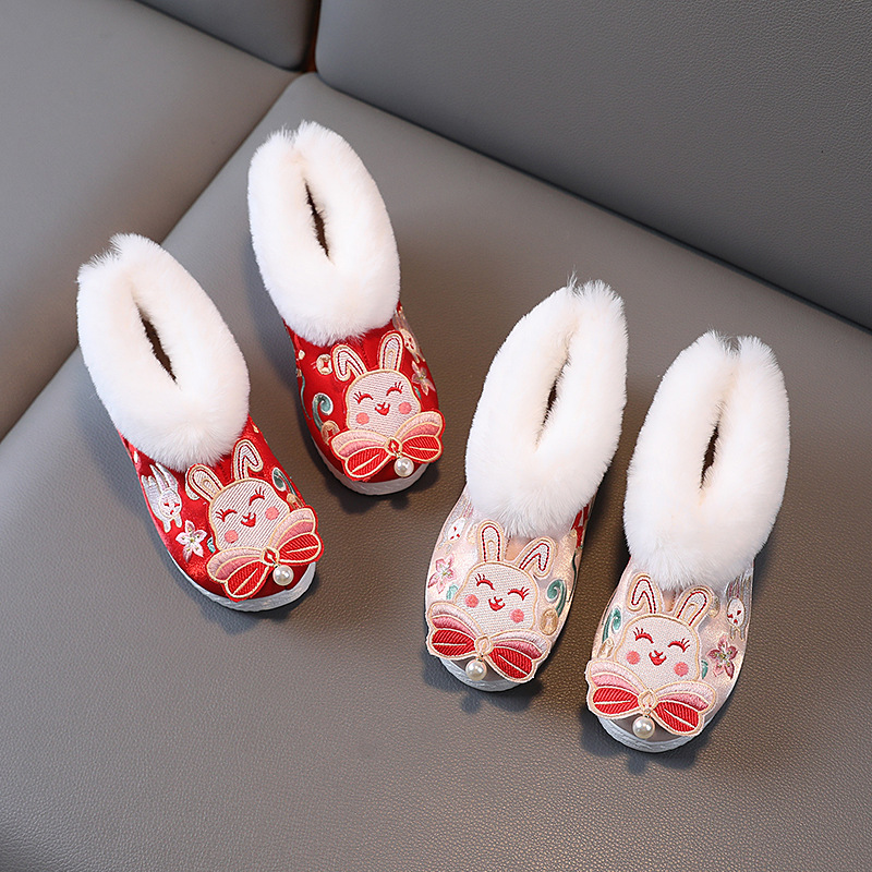冬のベルベットの厚いウサギのビーズの柔らかい底の子供の刺繍靴の女の子の漢服の靴の手作りの布靴の新年の靴