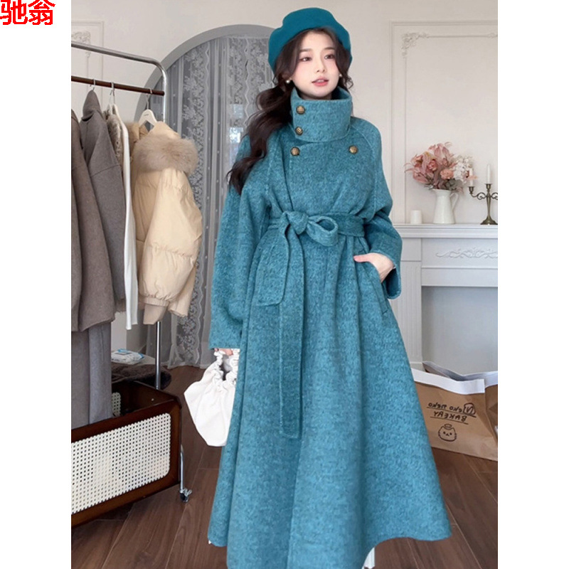 T8Y2024秋冬新作高級感ピーコックブルー両面カシミヤコート女性フランス名媛ウールコート