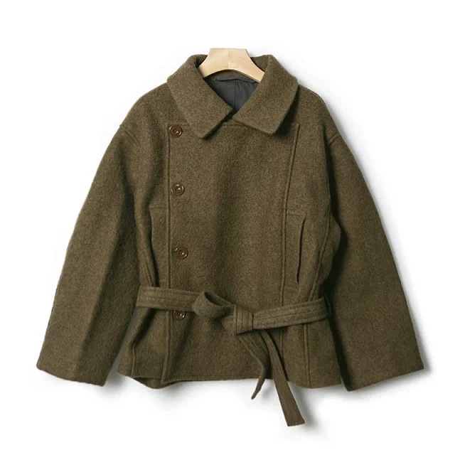 レム秋冬ショート非対称コート秋冬高襟ストラップ付き包み感レトロウール折り襟ショートコートレディース