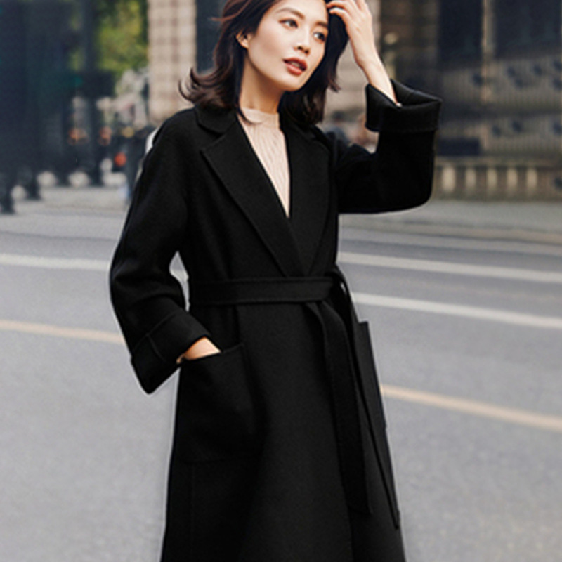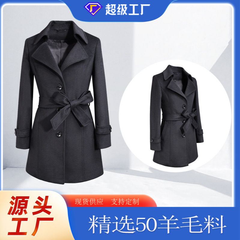 現物黒50% ウールコート女性の中長タイプの高級ウールスーツコート