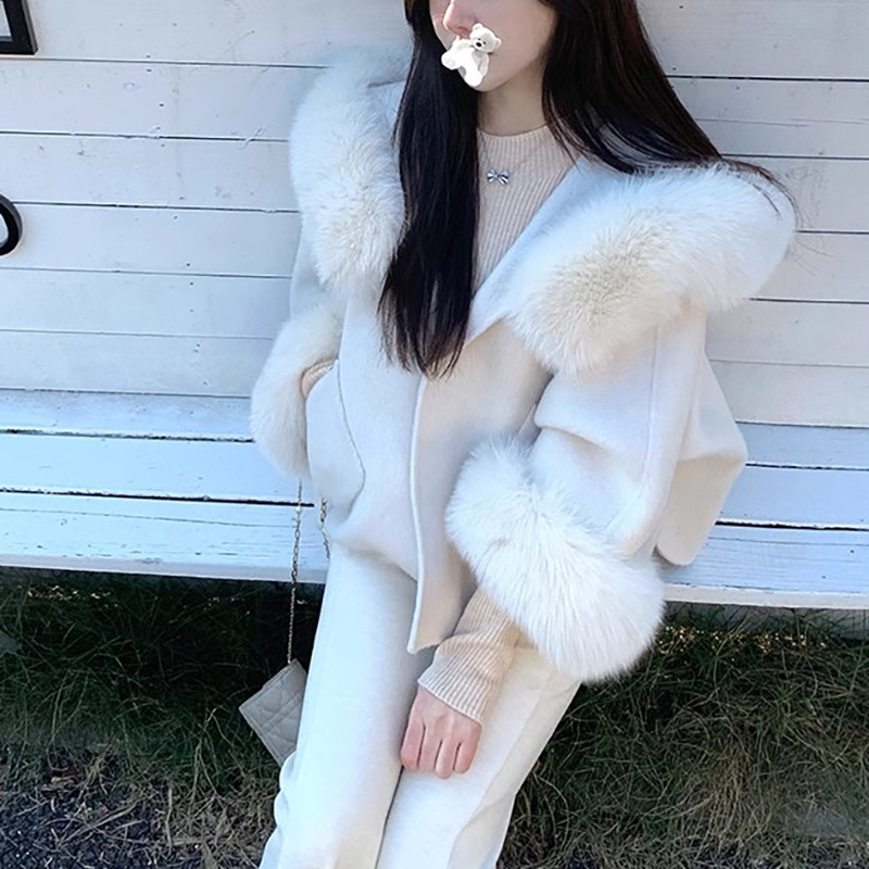 カスタマイズされた翡翠ウサギの妹の大きな毛皮の襟のショートマントウールコートキツネの毛皮のコートで暖かく保ちます