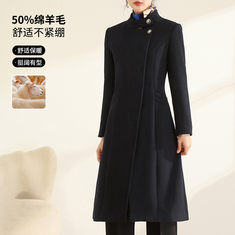 秋冬の新型毛はコートの女性の立襟の長いタイプの高級感の通勤のウールのコートのホテルの銀行の工服です。